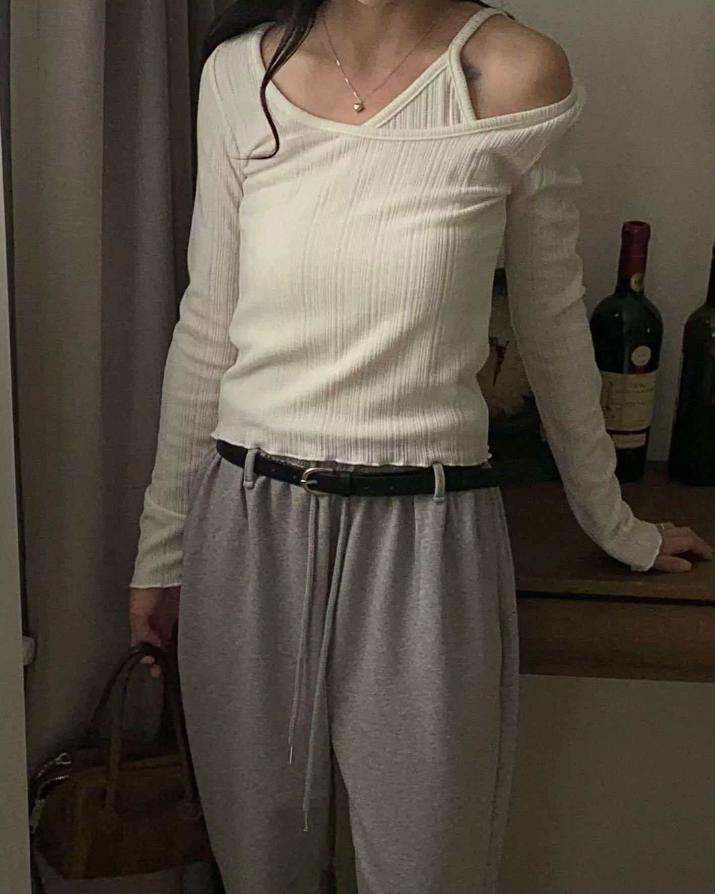 小性感坑條疊穿針織上衣 (白)