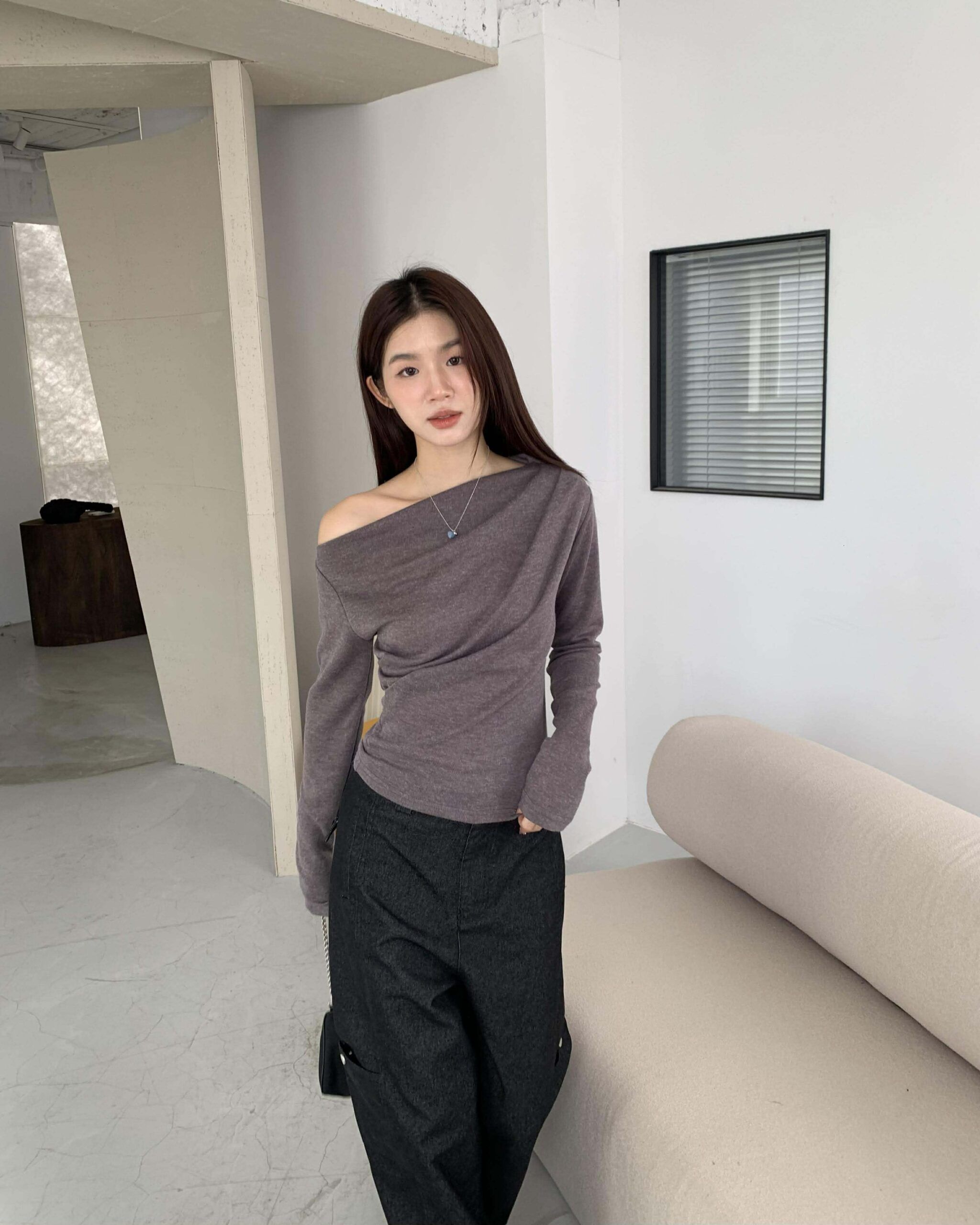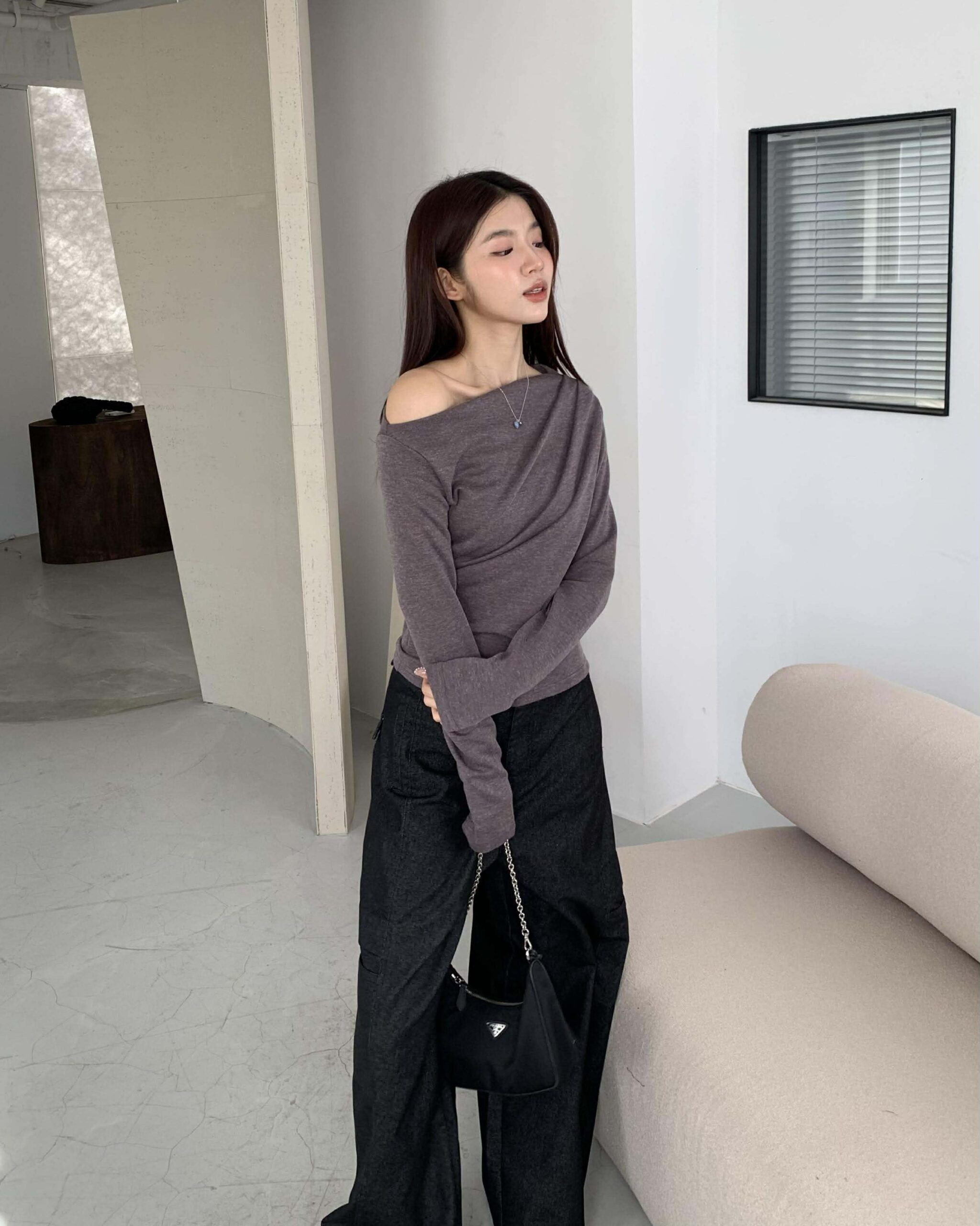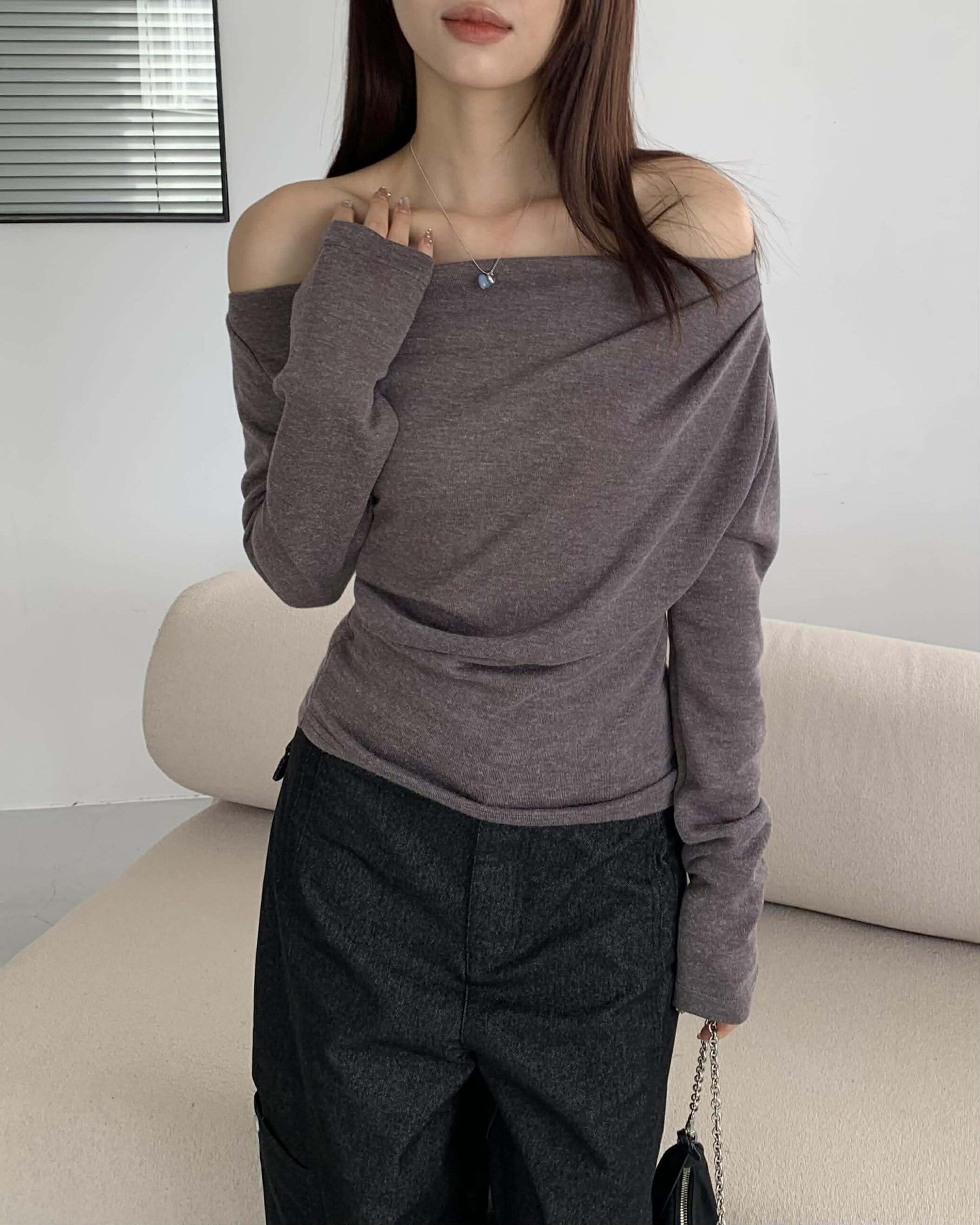 歐膩質感抓皺斜肩上衣 (摩卡)