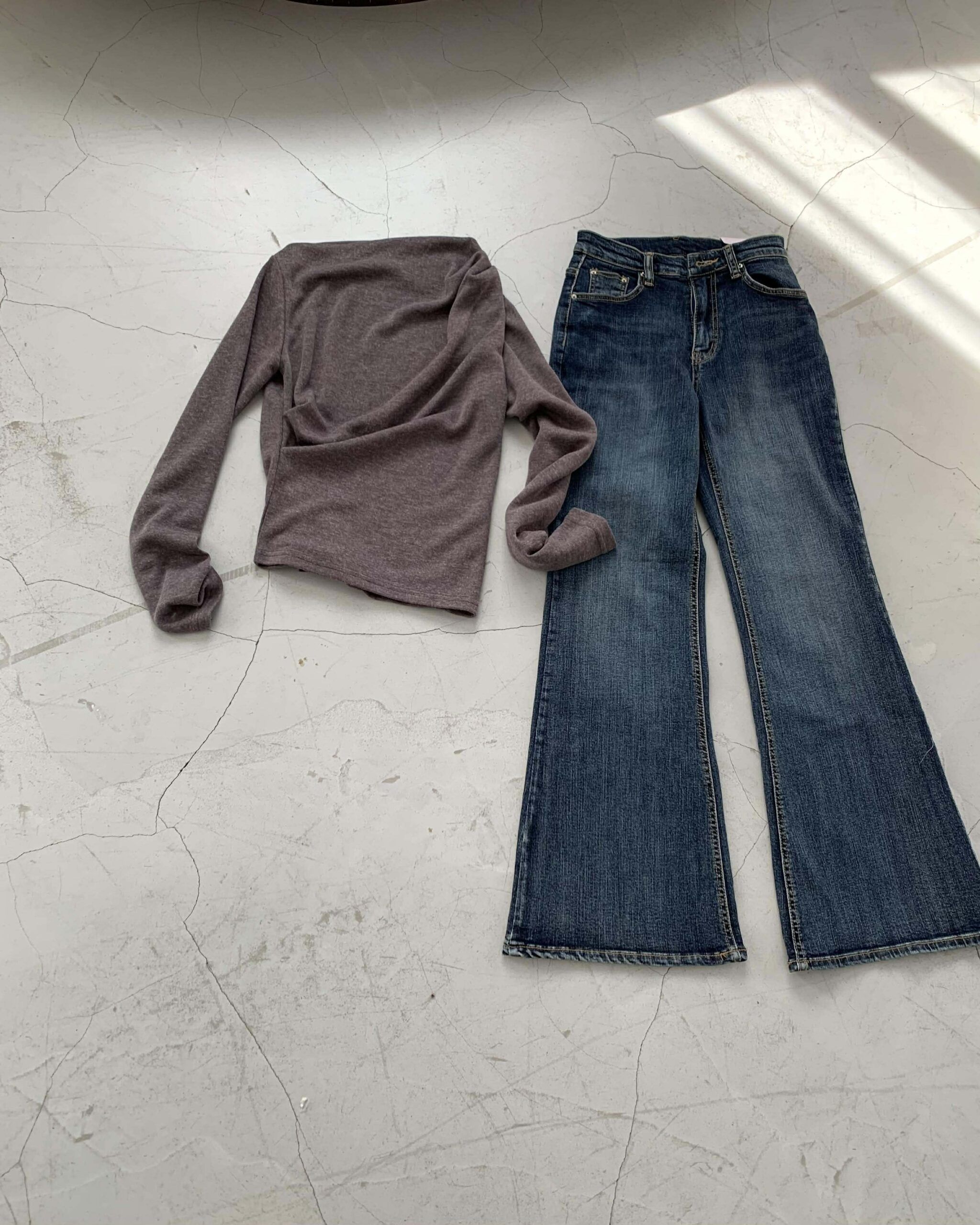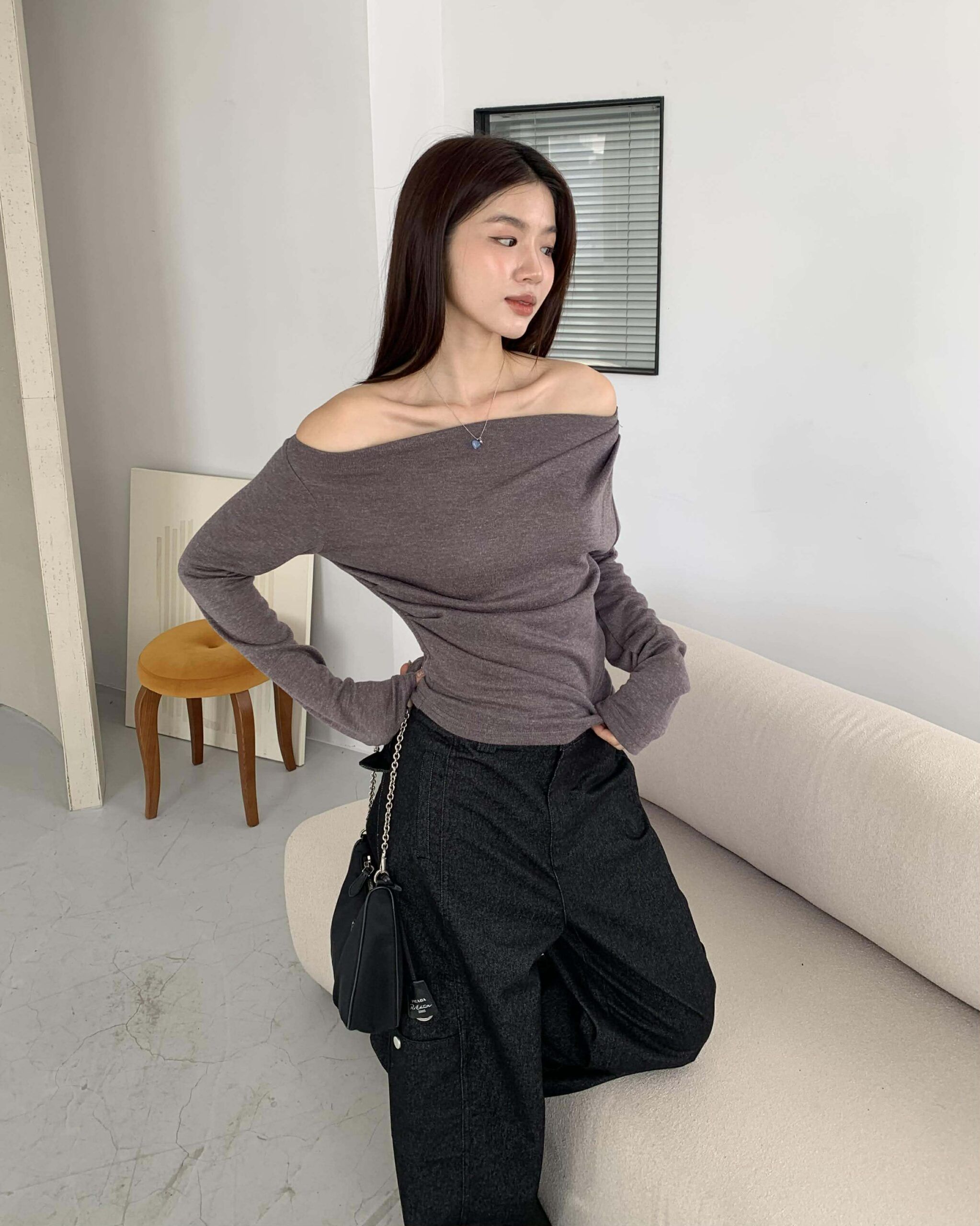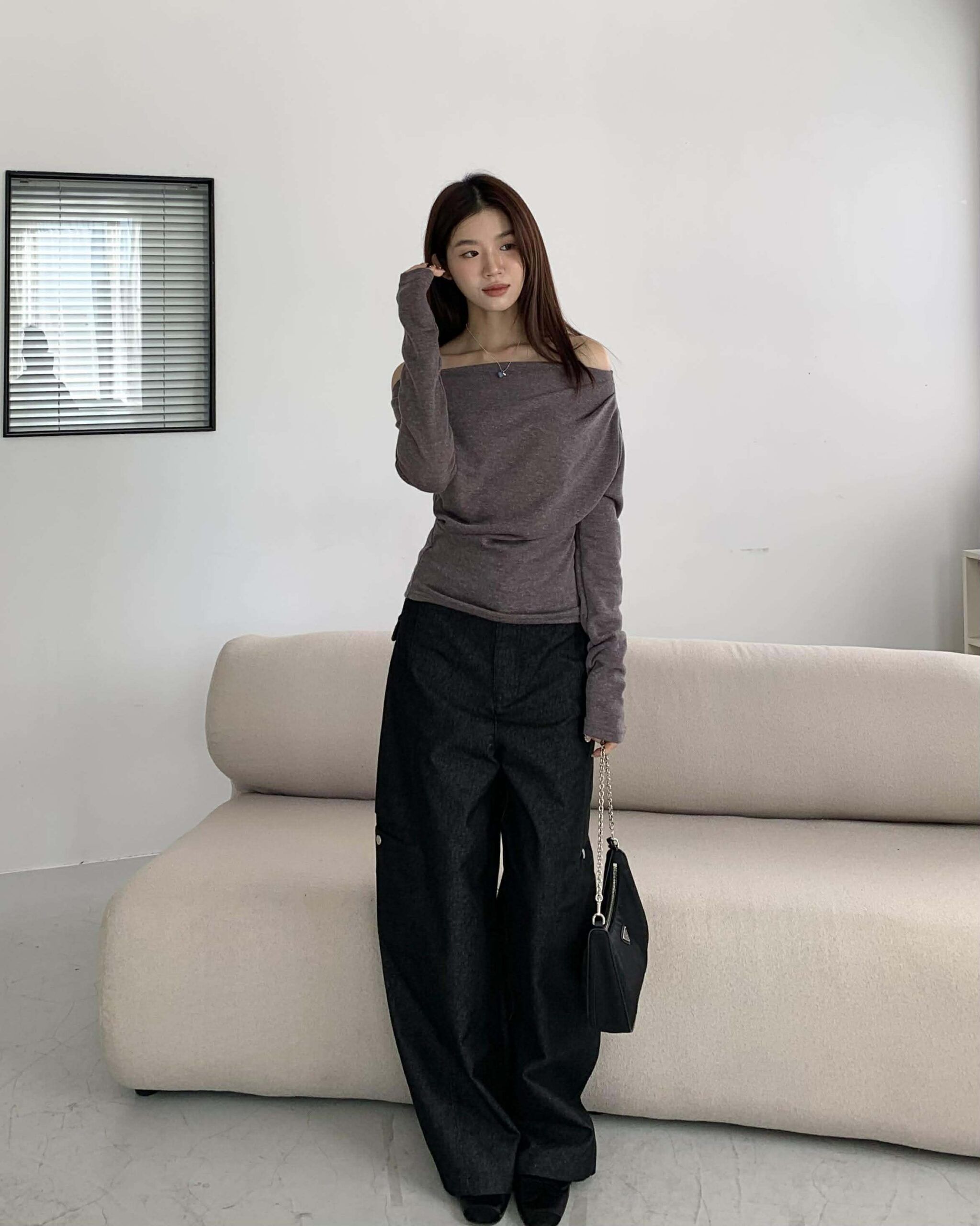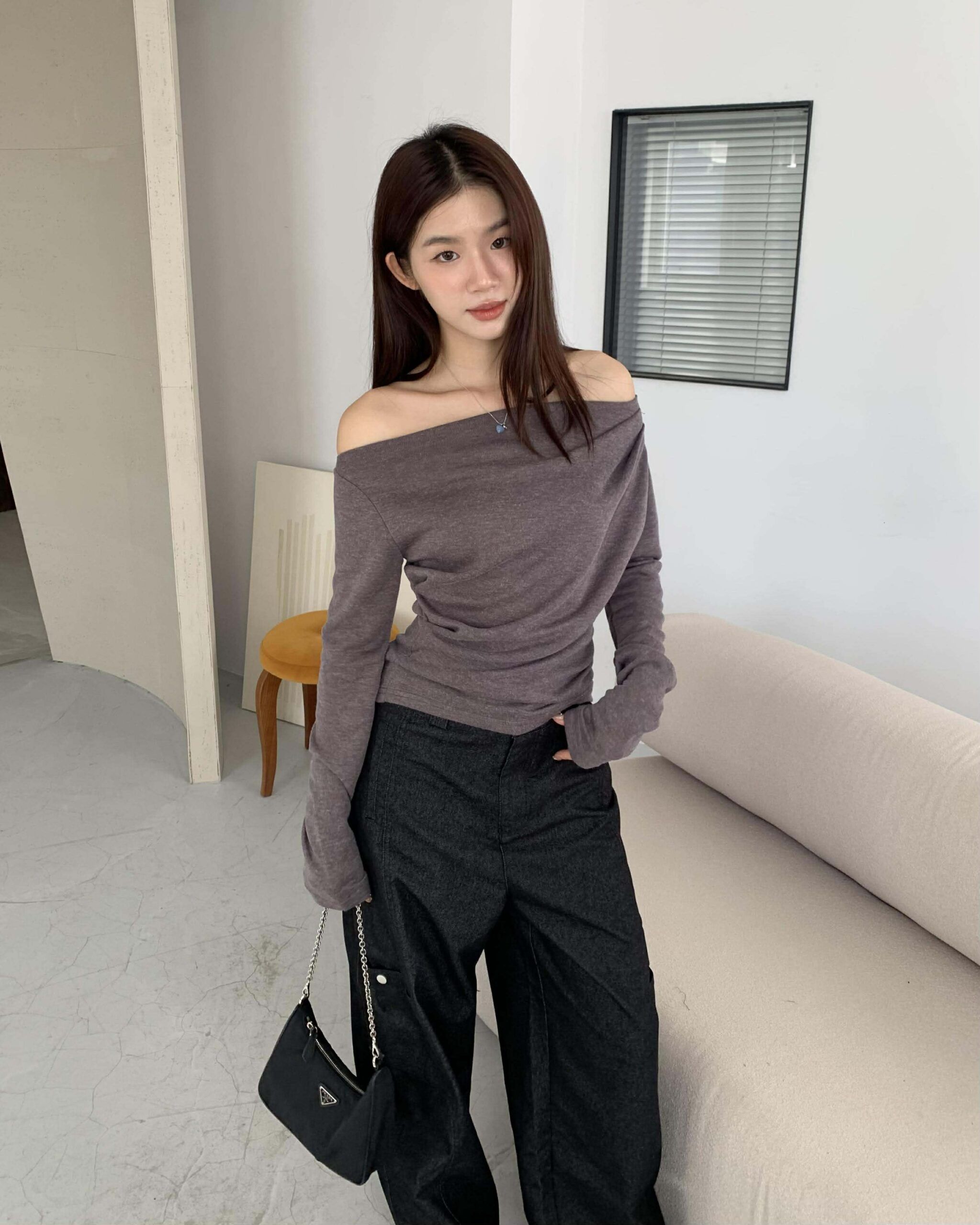 歐膩質感抓皺斜肩上衣 (摩卡)