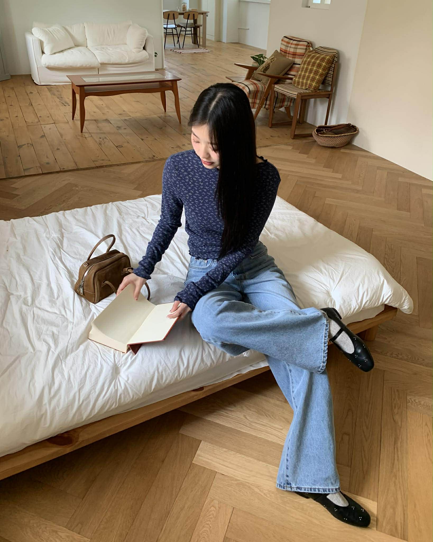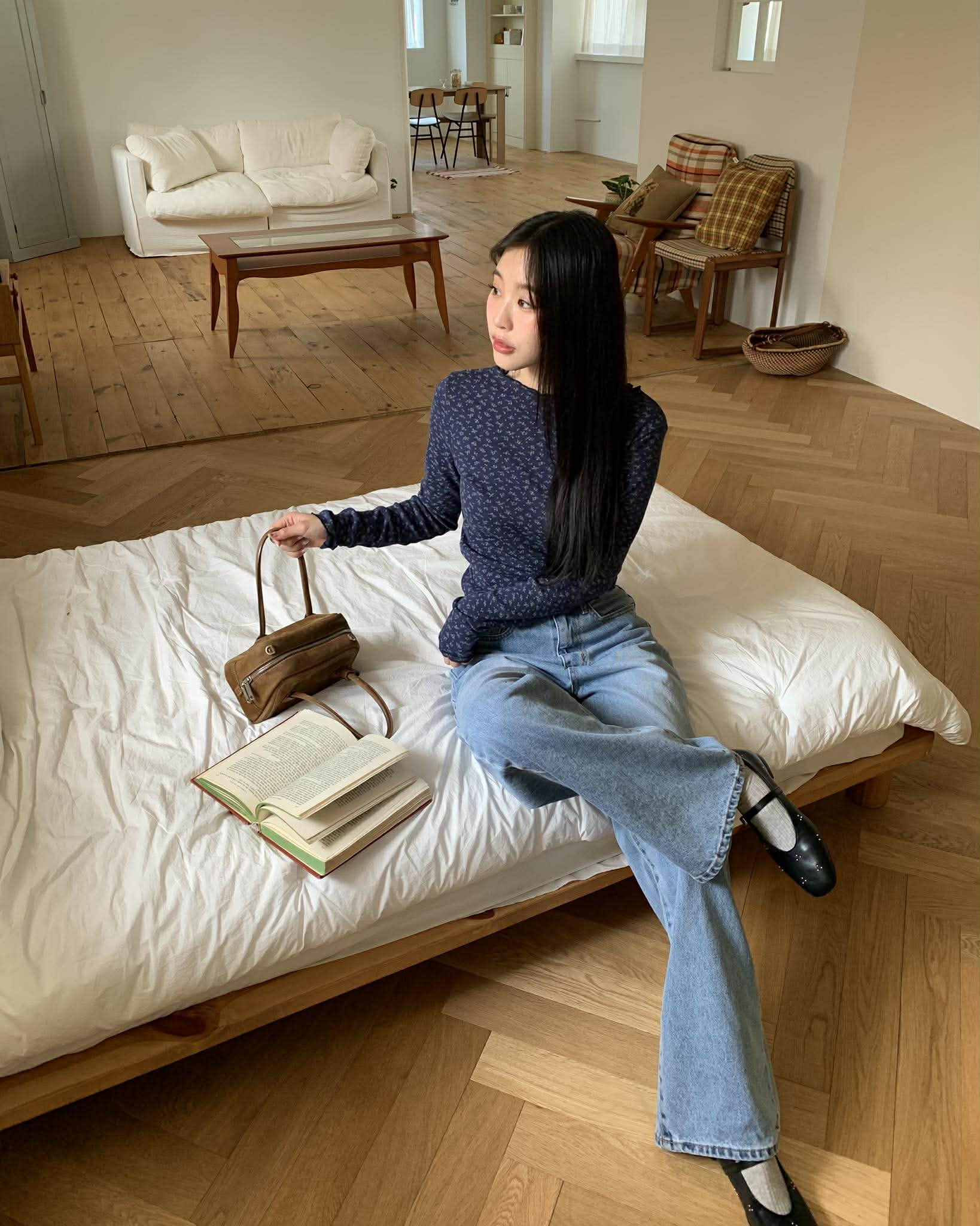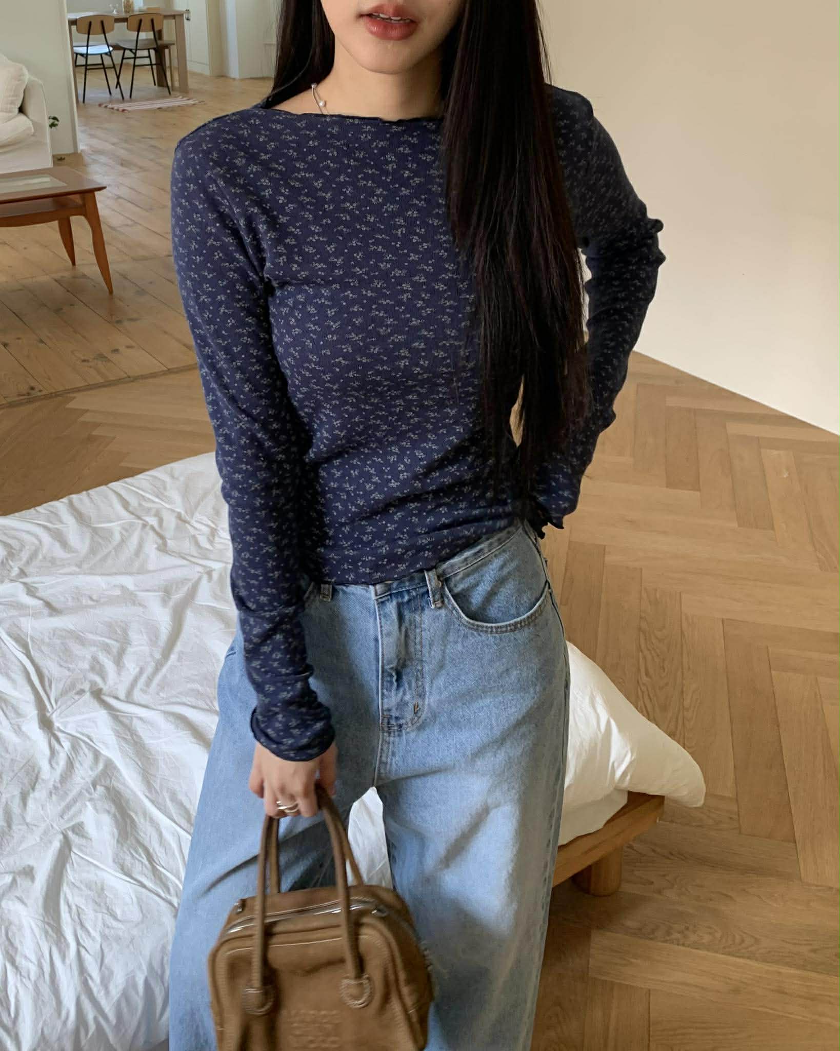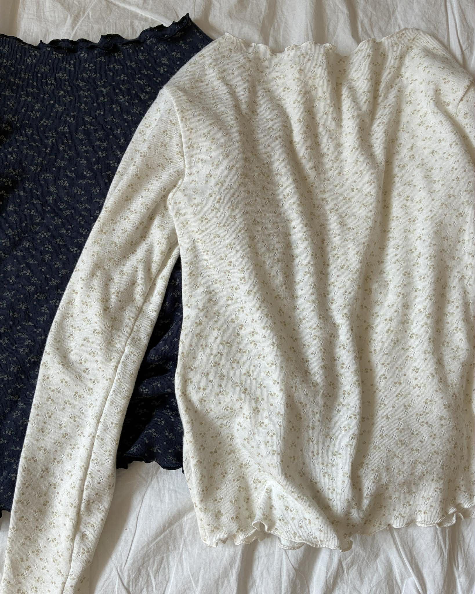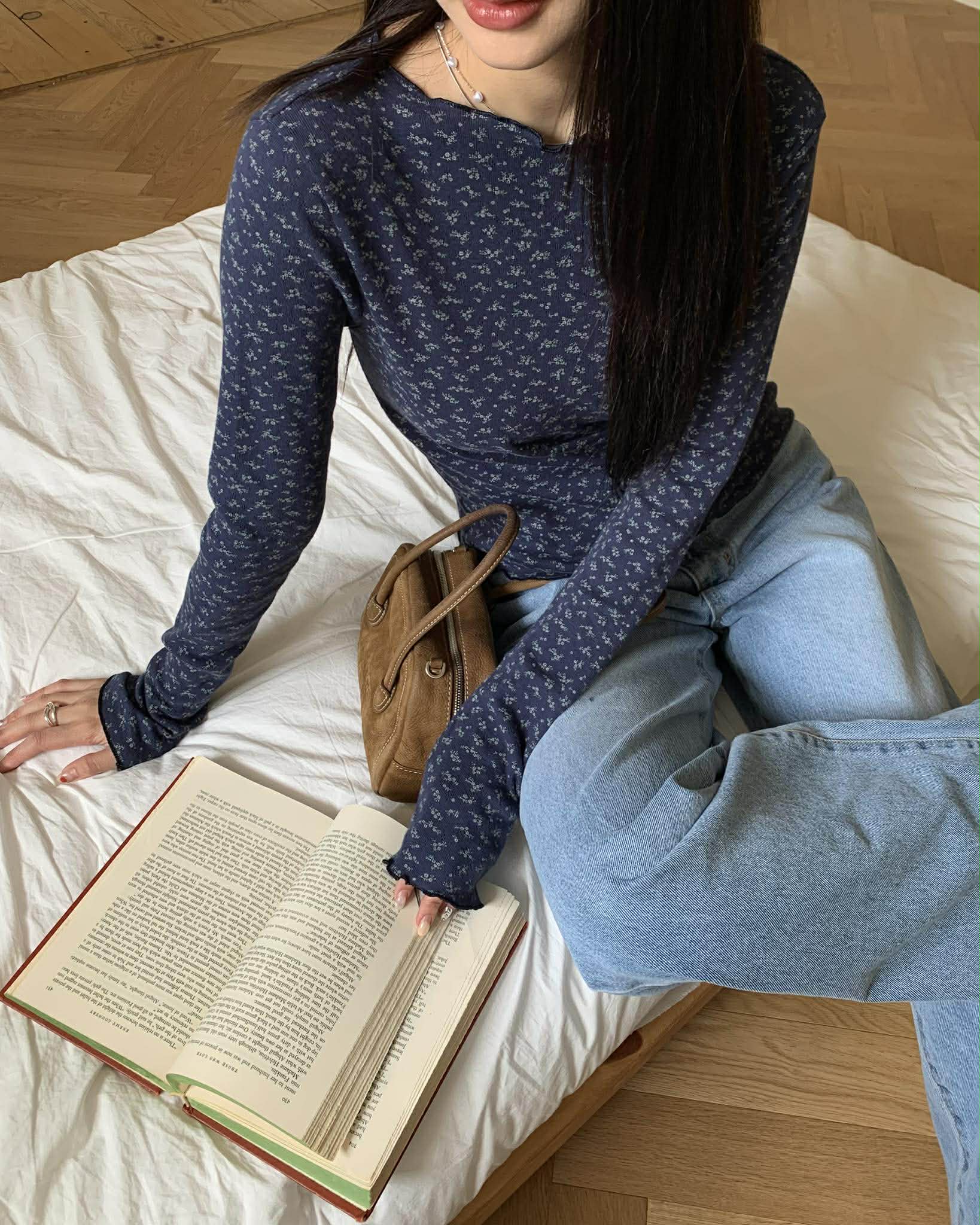 細緻簍空小花捲邊上衣 (深藍)